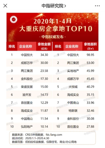 近期,中指研究院發(fā)布了2020年1-4月大重慶房企拿地TOP10,海成集團(tuán)以拿地金額11.87億、拿地面積35.15萬㎡ 進(jìn)入TOP10 。