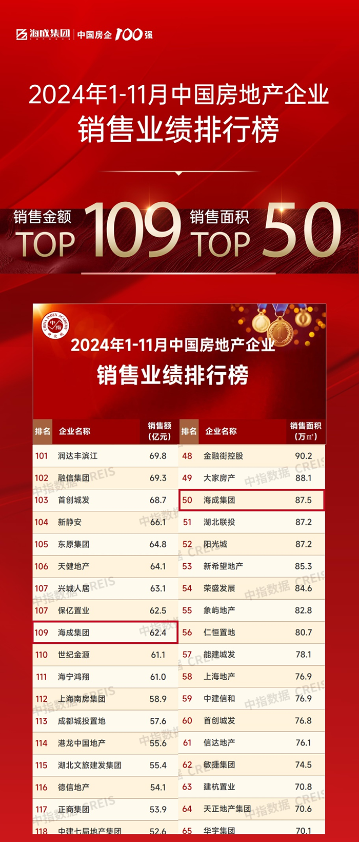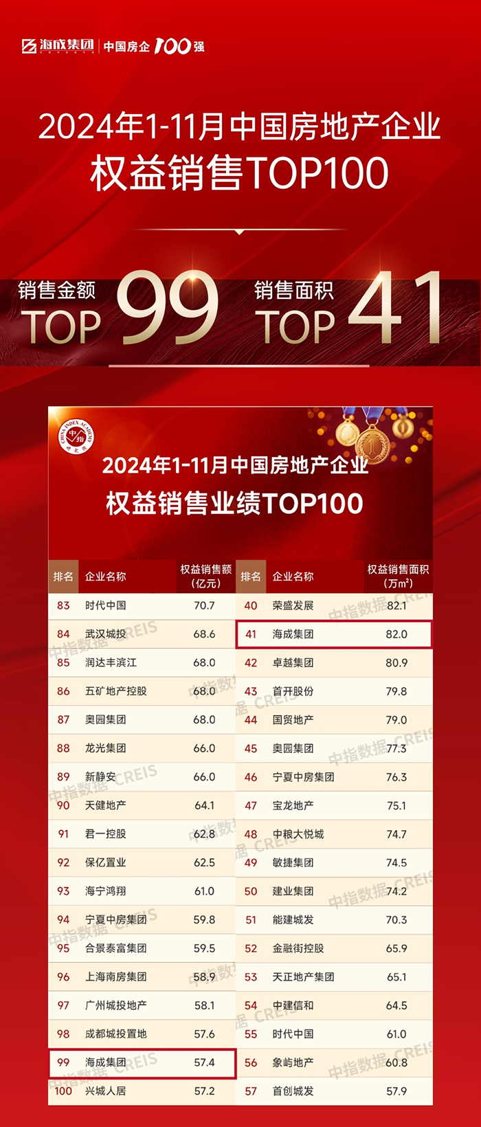 海成集團(tuán)位列1-11月全國(guó)房企銷售面積TOP50、銷售金額TOP109;權(quán)益銷售面積TOP41、銷售金額TOP99
